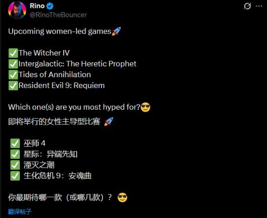 近期,游戏资讯博主@RinoTheBouncer汇总了接下来即将推出的几款以女性为主角的游戏大作,并向玩家询问最期待哪款或哪几款游戏。