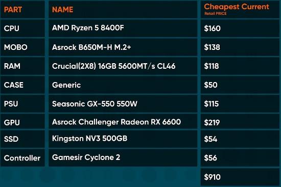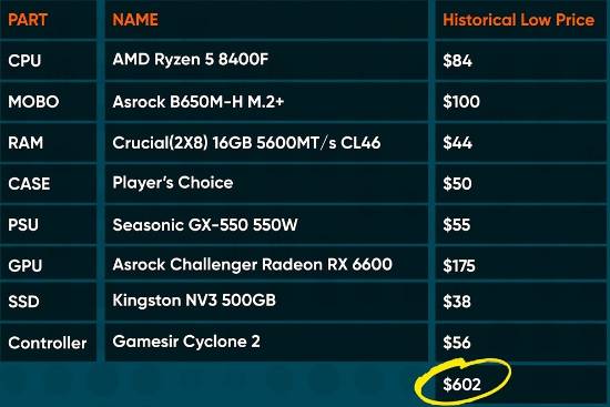 内存则使用美光的2x8G 5600内存;电源方面找不到300瓦台式机电源,只好用海韵550瓦代替;M2固态盘参照样机的配置选用金士顿NV3 500GB,最后加上优选手柄与机箱,全套散件按历史最低价算,总计602美元: