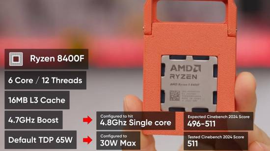 他在节目中列举了相关硬件成本,比如半定制六核CPU,规格接近Ryzen 5 7540U,由于这是移动版本CPU,不可能找一块主板把它焊上,只能用台式机CPU Ryzen 5 8400F与B650M-H华擎主板来模拟,同时注意限制主频和功耗:
