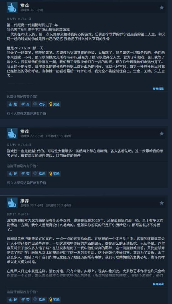 值得注意的是,尽管原作剧情自 2020 年发售以来始终伴随争议,但 PC 版推出近一年后,玩家评价更趋理性。多数给出好评的玩家表示,抛开初期对剧情的争议,重制版在战斗机制打磨、角色情感刻画与细节补充上的表现 “无可挑剔”;即便对剧情持有不同看法的玩家,也认可其 “在整体协调性上仍是独一档的存在”。