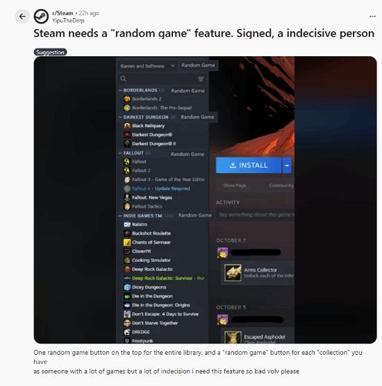 针对这一问题,Reddit用户YipuTheDerp近期发起倡议,呼吁Valve为Steam添加“随机游戏”功能,称自己的“选择困难症”是核心原因。他还进一步提出,该功能可采用“基于游戏集的随机机制”,允许用户将随机范围限定在自定义游戏收藏夹内,从而按需缩小选择范围。这条帖子发布15小时内便获得超过8600次点赞及数百条评论,并于11月29日登上Steam社区首页顶端,可见相当一部分玩家群体对此表示支持。部分用户认同发起者的观点,称在不确定接下来玩什么时,随机功能能帮助他们“攻克”日益庞大的Steam游戏库存;另有用户表示,即便仅出于新鲜感也期待该功能——他们认为,发掘一款意外合心意的游戏本身就能成为一种“元游戏”体验,类似收集Steam集换式卡牌的乐趣。