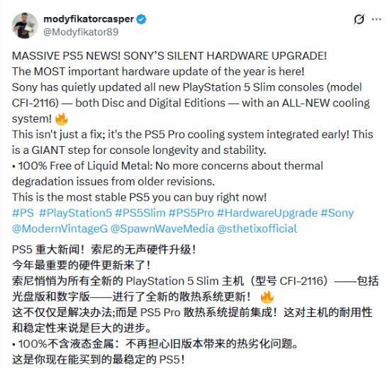 2025 年 11 月 30 日,据海外博主 modyfikatorcasper 爆料,索尼已对新款 PS5 Slim 主机(型号 CFI-2116,含光驱版与数字版)进行硬件升级 ——直接集成了原本为 PS5 Pro 准备的全新散热系统,这也是今年 PS5 最重要的硬件调整。