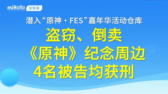 米哈游法务部今日发布案件视频——破坏门锁潜入“原神·FES”嘉年华活动仓库,不法分子盗窃《原神》纪念周边后,销赃获利20000余元。
