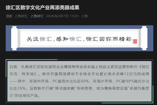 近日,上海徐汇官方公众号发布鹰角新作《明日方舟:终末地》销售数据报告。