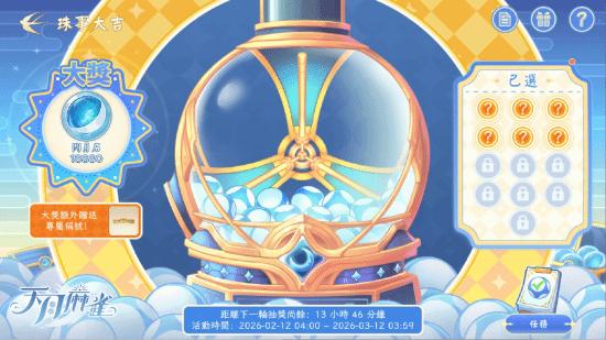 而春节另一项重头戏,首次推出的限时活动「珠事大吉」中,系统将在春节期间每日抽出 6 个号码,玩家只要于活动中选择幸运号码即可参与抽奖。只要所选号码与系统抽出的号码相同,即可获得闪月石奖励,相同数目越多,奖励越丰富。全中 6 个号码,更可一口气获得 18880 闪月石及「盖世欧皇」专属称号。