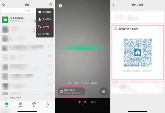 对于“面对面收照片和文件”功能,用户可以在微信首页点击右上角的「+」再点击「扫一扫」,然后依次点击「我的二维码-面对面收照片和文件」,此时对方扫描二维码即可发送相关文件。