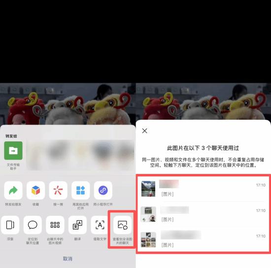 如图所示,如果用户已经忘记图都发给了谁,可以通过长按图片点击「查看该图片包含的聊天」,从而迅速锁定这张图的“流向”,点击聊天还能看看当时聊天记录。