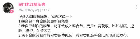 根据其最新发布的公告,未来的内容将划分为免费版与付费模组/会员两部分。老江头特别针对部分读者的误解进行了重点澄清:首先,现有的整合包本体将维持原状,继续保持稳定更新且完全免费;其次,由其个人原创打磨的模组(如高精度材质、定制捏脸、模型及关卡等)将不再内置于免费包中,转为付费获取;最后,原本免费提供的教学视频,未来也将通过平台“充电”等付费形式发布。