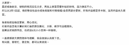 由于长期遭受作品被未授权倒卖的困扰,加之现实生活的经济压力,老江头决定开启部分内容的付费模式。