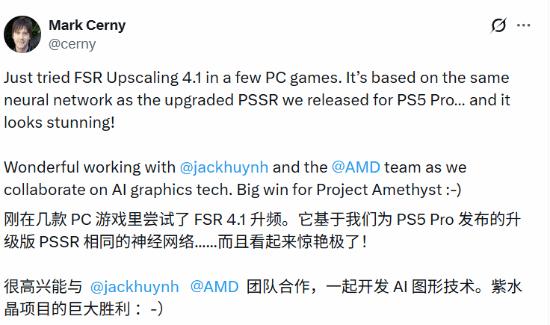 马克·塞尼在发文中兴奋地表示:“刚刚在几款 PC 游戏中测试了 FSR Upscaling 4.1。它的底层逻辑与我们为 PS5 Pro 推出的升级版 PSSR(PlayStation Spectral Super Resolution) 基于同一个神经网络……视觉效果简直惊人!”